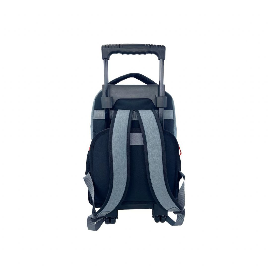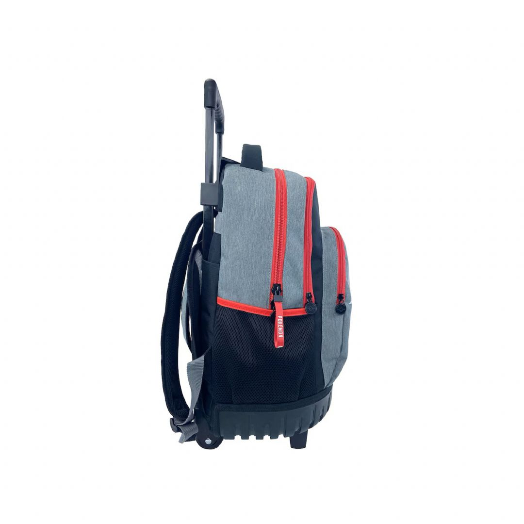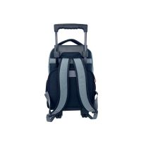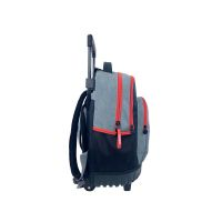 Praktischer Schulrucksack mit Trolleyfunktion. Aus Polyester und Kunststoff gefertigt, mit drei geräumigen Hauptfächern und einer Seitentasche für Trinkflaschen mit verstärktem Netzgewebe.