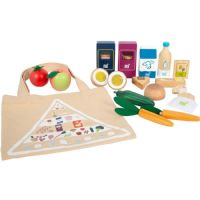 Fleischlose Gerichte aus der Kinder-Spielküche! Dieses umfangreiche Set an Spielzeuglebensmitteln umfasst typische Nahrungsmittel und Getränke, die zu realistischen Rollenspielen rund um das Thema einer ausgewogenen vegetarischen Ernährung anregen. Highlights sind die Reis- und Nudelverpackungen mit transparentem Sichtfenster sowie der Baumwoll-Einkaufsbeutel mit aufgedruckter Ernährungspyramide – so lernen Kinder etwas über richtige Ernährung! Milch, Butter, Käse, Öl, ein Ei, Reis, Nudeln, Brot, ein Apfel, Tomate, Gurke und Karotte – das große Sortiment an vegetarischen Spiellebensmitteln lässt in der Kinderküche und im Kaufladen keine Wünsche offen. Eine Flasche Wasser und ein Teebeutel aus Holz machen dieses Set komplett. Das Besondere an der Verpackung für Reis und Nudeln ist, dass ihr Inhalt hinter einer Plexiglasscheibe sichtbar ist und beim Schütteln Geräusche macht.